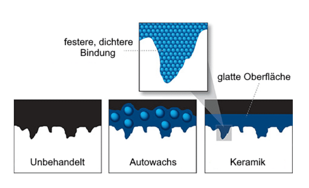 Da Keramik aus deutlich kleineren Partikeln besteht, kann sich diese viel besser einsetzen und den Lack viel glatter machen, was nicht nur für ein sehr schweren Halt für Schmutz und Wasser sorgt, sondern auch die Farbe intensiviert und für noch mehr Glanz sorgt.